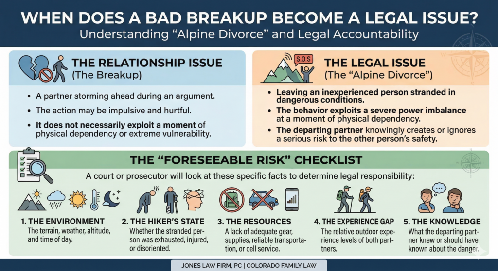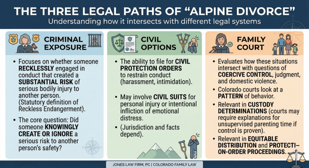 That does not mean every “alpine divorce” incident would support criminal charges. But it does mean the law is asking a more concrete question than people often assume: did someone knowingly create or ignore a serious risk to another person’s safety? A court or prosecutor would look at things like: